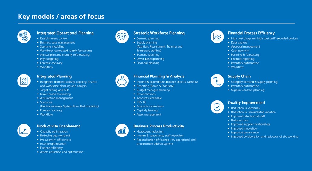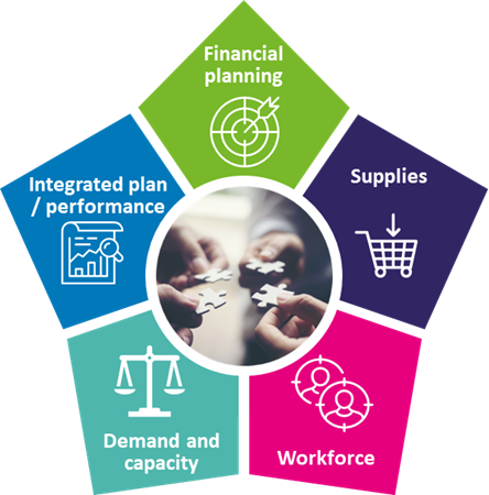 Our ambition is to support and enable our partners to deliver integrated resource management that can effectively meet their local challenges. These are complex and diverse, but all involve understanding the changes needed in capacity, facilities, workforce, finance, and supply chain. Planning models will be built for professional leads, for services and pathways, for population groups, across single organisations through to a collaboration across several entities and geographies.