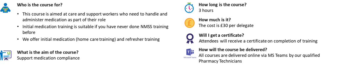 This course is aimed at care and support workers who will need to handle and administer medication as part of their role. Workers should be working in a home care setting. Initial Medication Training is suitable if you have never done NMSS training before or want a full days’ knowledge and content.